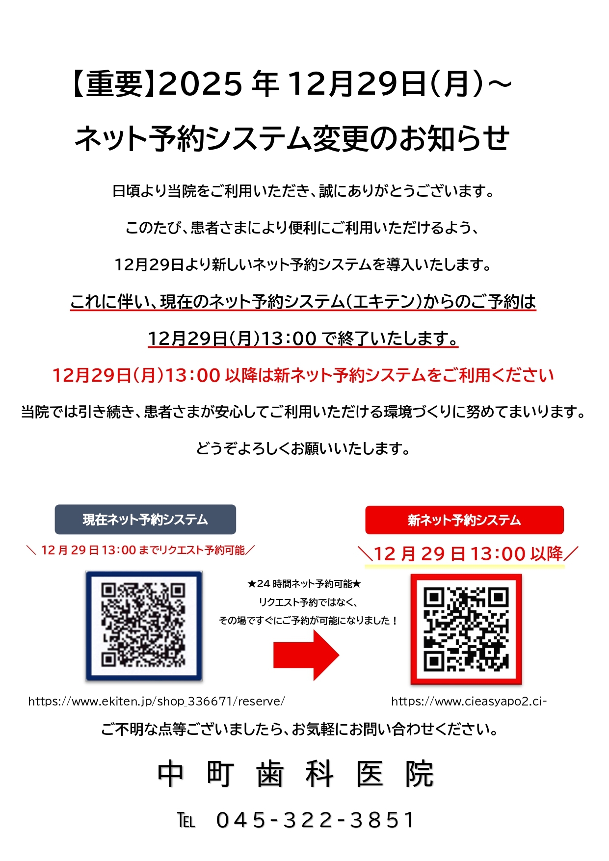 これに伴い、現在のネット予約システム(エキテン)からのご予約は12月29日(月)13:00で終了いたします。