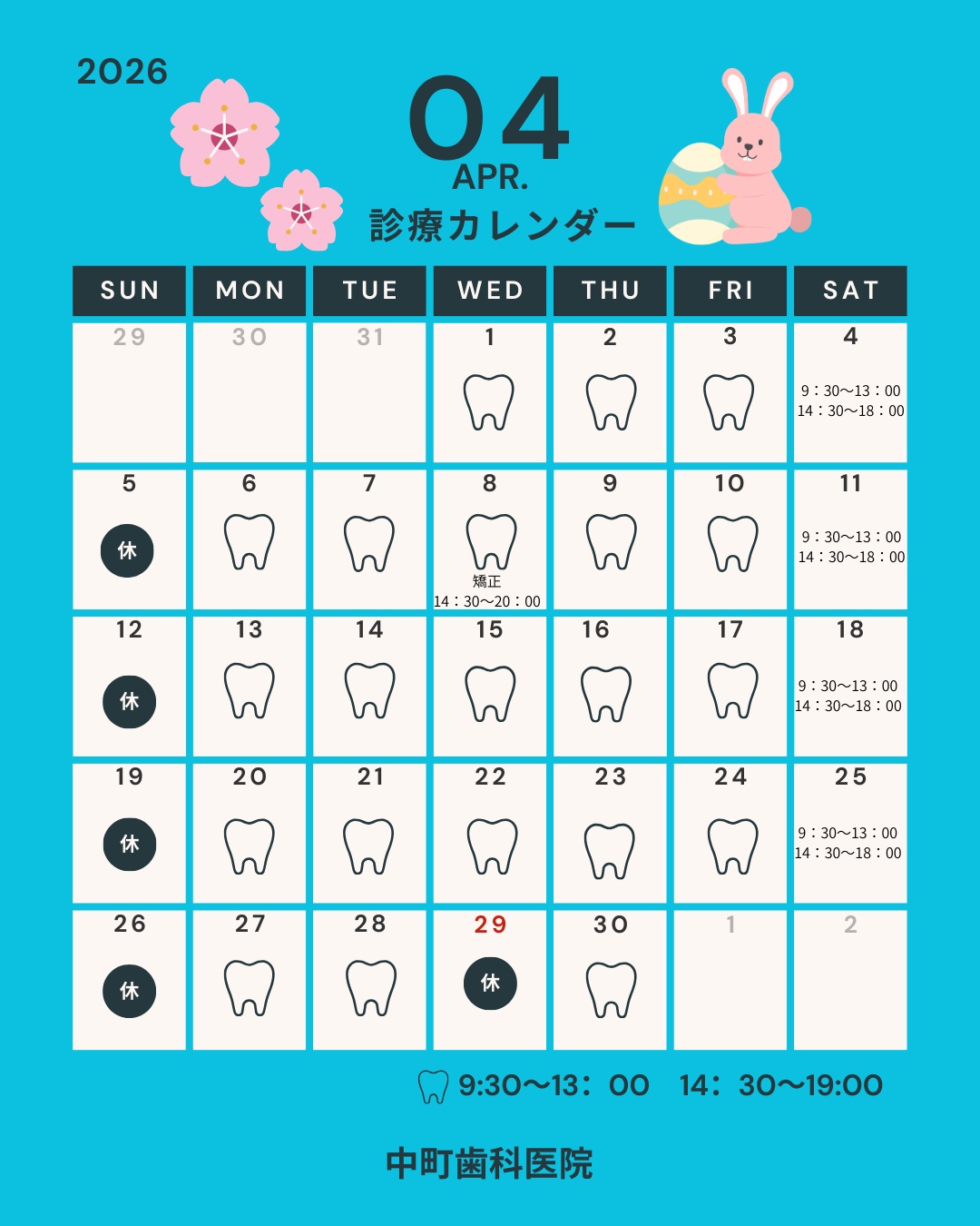 4月休診日のお知らせ|中町歯科医院 横浜駅から1駅、三ツ沢下町バス停目の前